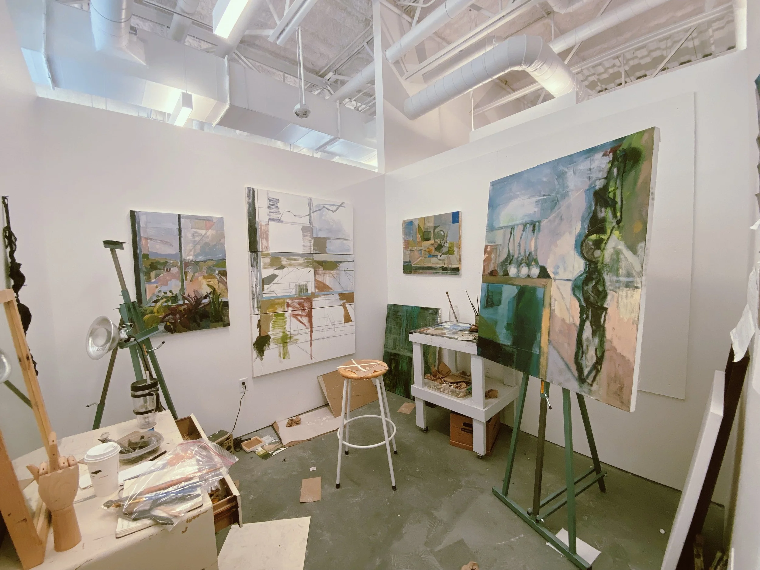 Her paintings explore varying ways of observing color, time, location, still life, and even finished paintings. Both her still life setups and found spaces hold a personal connection. She works on the same painting at different times of day, through the changing seasons, and shifting viewpoints.